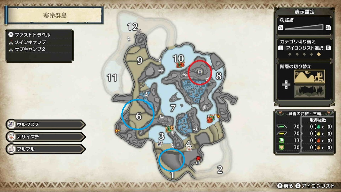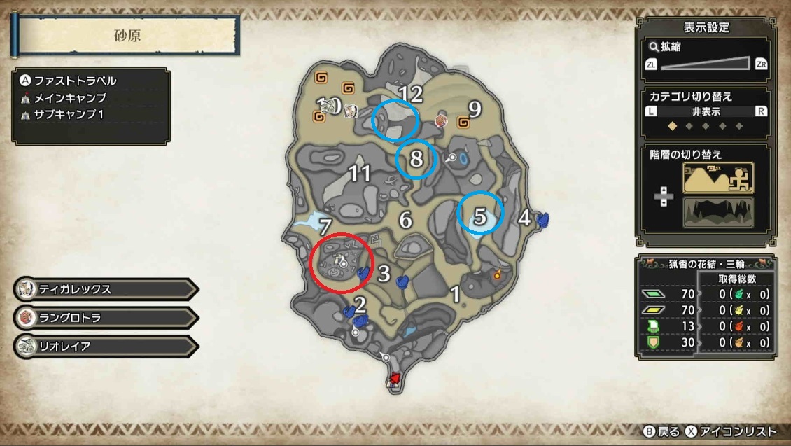 ※地図の赤丸がサブキャンプの位置、青丸はモンスターの位置を表しています。