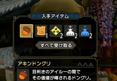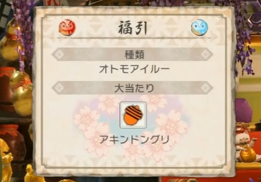 「ノーマル」と「当たり」ではアキンドングリが1個、大当たりで2個もらえます。アイルーの福引ではアキンドングリと謹製おだんご券が必ず手に入るので、かなりお得かもしれません。