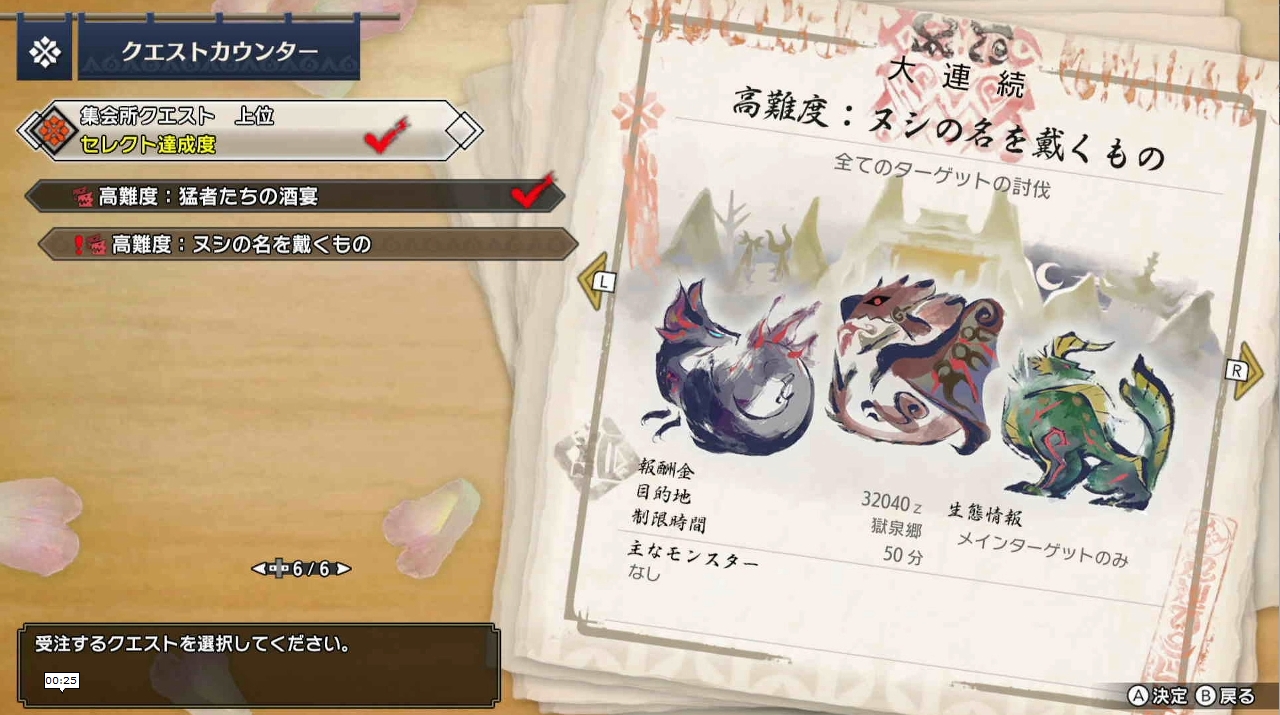 夜の獄泉郷での連続ヌシ討伐クエストです。