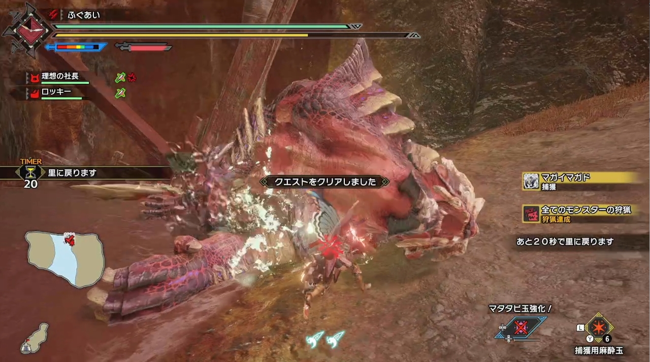 一頭目を狩猟し、モンスターが消滅したタイミングでマガイマガドが出現しました。