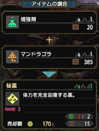秘薬は強いのでぜひ持っていきましょう!調合分の増強剤とマンドラゴルァも持っていこう!(‘ω’)ノ