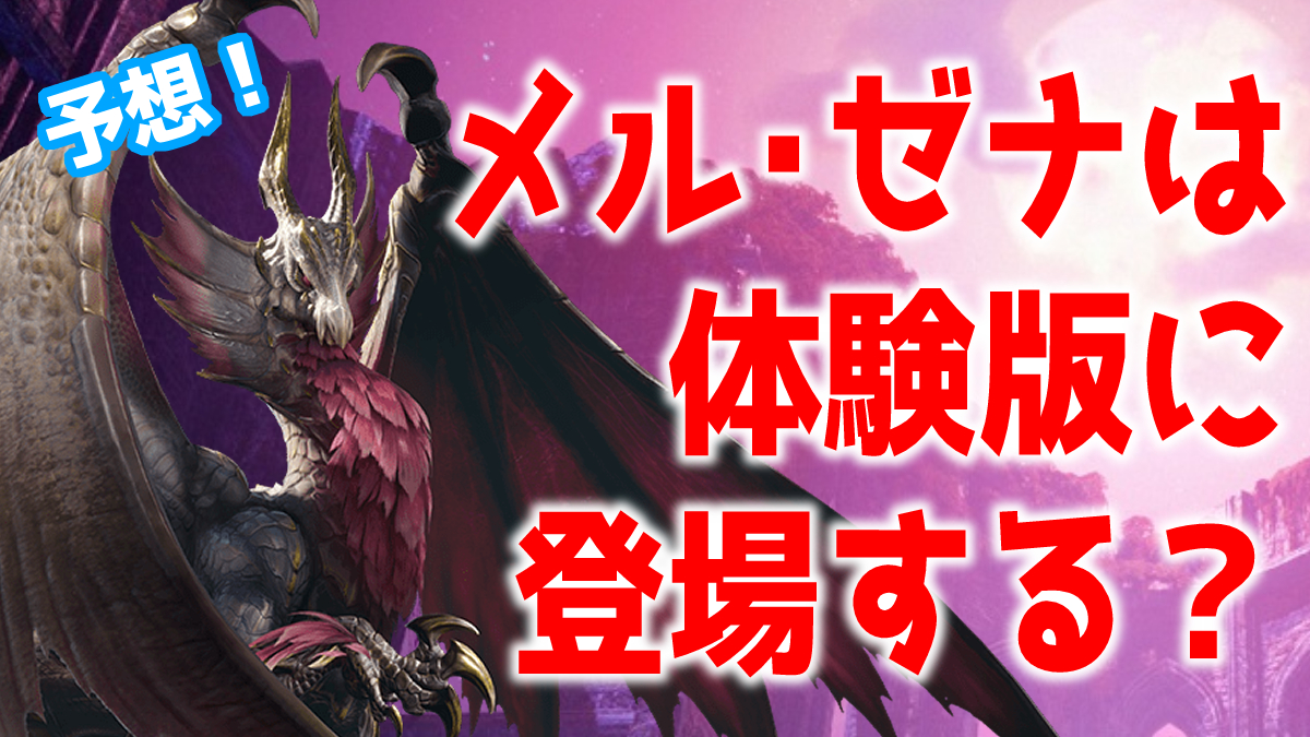 メインモンスターが体験版に登場することに関して「重要なモンスターならば体験版で出さないで欲しい」という意見もありますが、カプコンとしては作り込みに自信のあるモンスターでありソフトの代表として紹介したいために体験版で出しているのだと思います。ゆえに今回もメル・ゼナが体験版に登場する可能性は非常に高いと予想します。