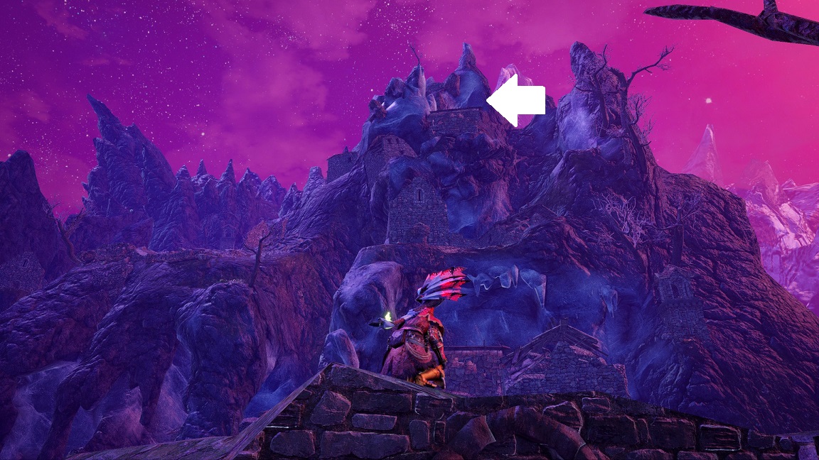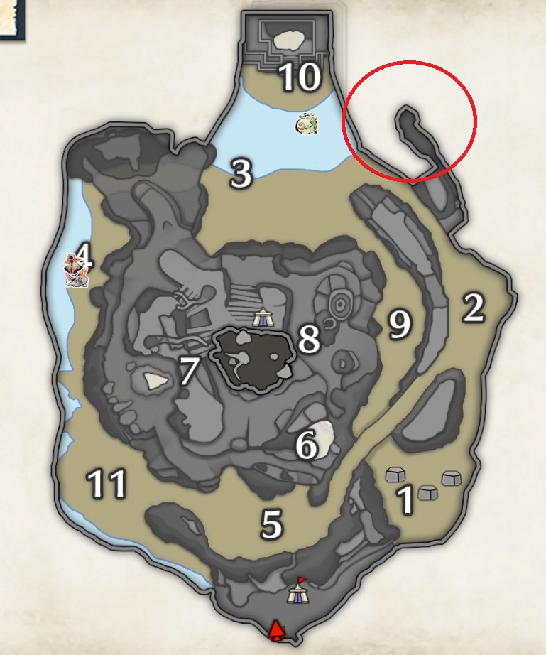 メルゼナの城側から見ると白い矢印にいます。西側から少し遠回りしていく楽に行けます。