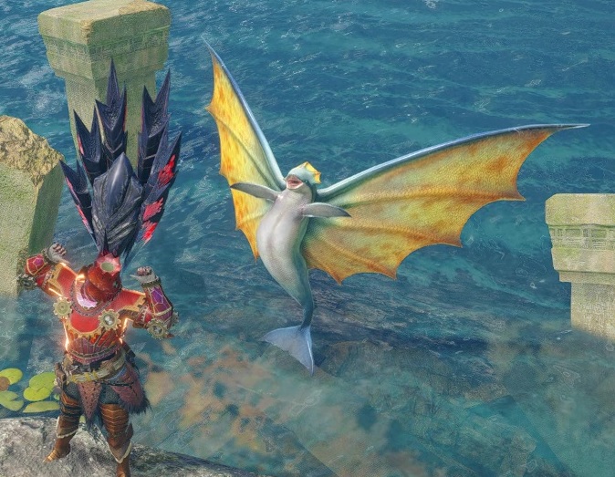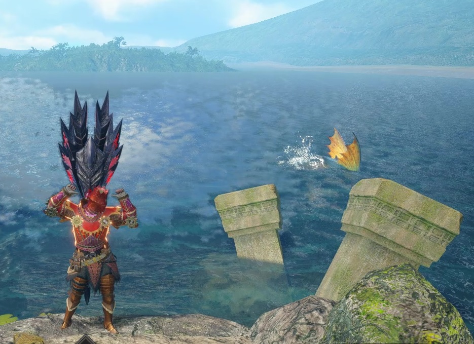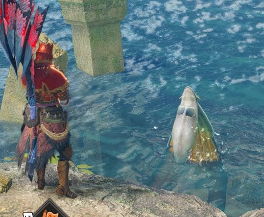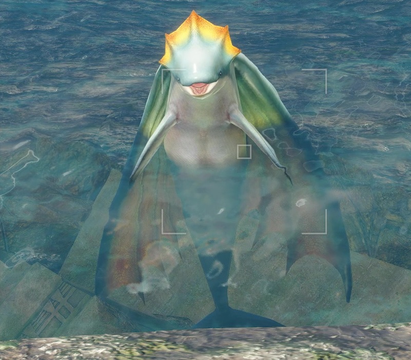 場所はマップ右上の洞窟の海辺です。小型モンスター討伐のクエスト開始直後に行くと画面奥から泳いできました。