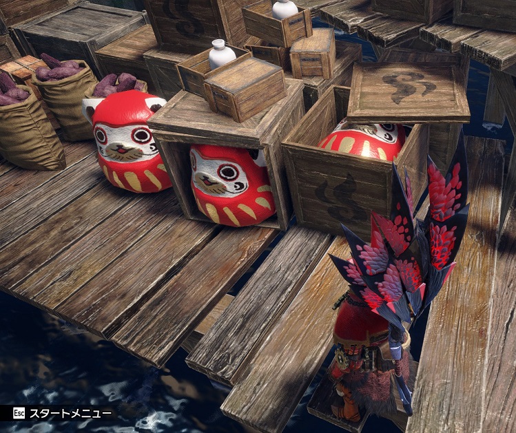 最後の画像のアイルーダルマの所、クエスト毎に荷物変わって横にいるNPCからアイテム貰えるの知ってる?