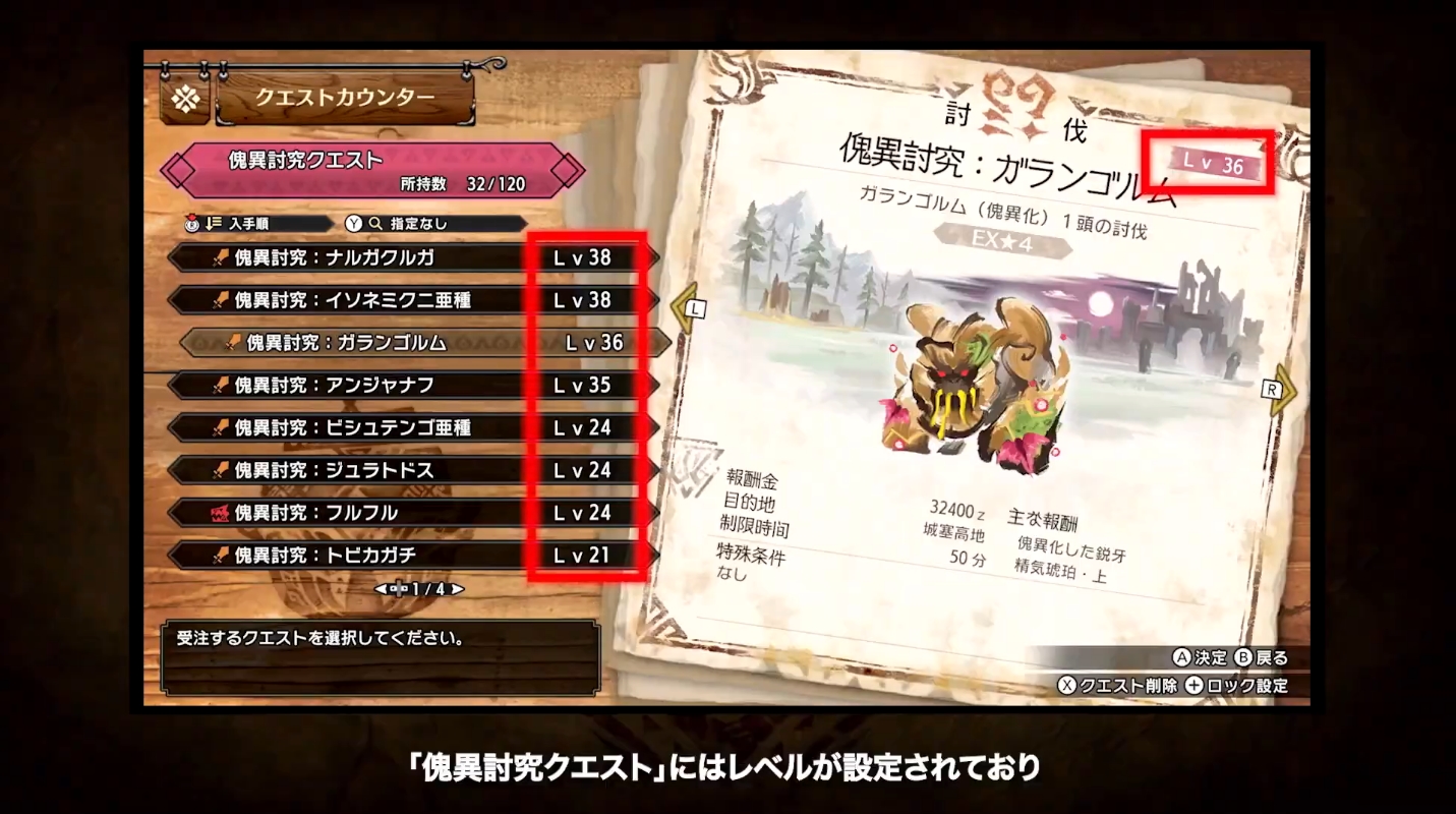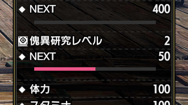 「傀異討究クエスト」を進行すると傀異調査ポイントが得られ、ポイントを一定数貯めることで「傀異研究レベル」が上がる。