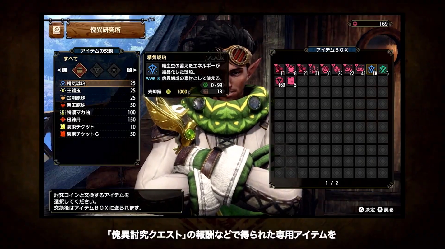 傀異討究クエストの報酬などで得られた専用アイテムを精気琥珀などのアイテムと交換可能。