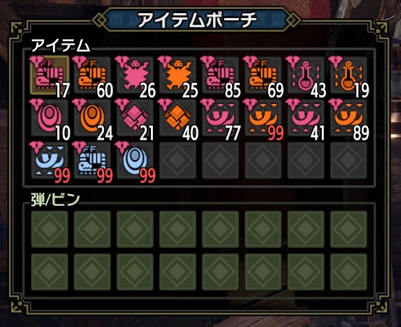 傀異素材の数はアイテムセットに登録することで確認しやすくなります。注意点としてセットに登録された時の数しかポーチに入らないので、セットを呼出したらXボタンで「一括補充」しましょう。
