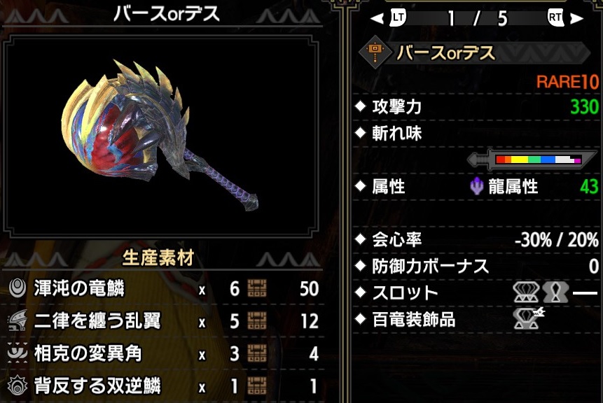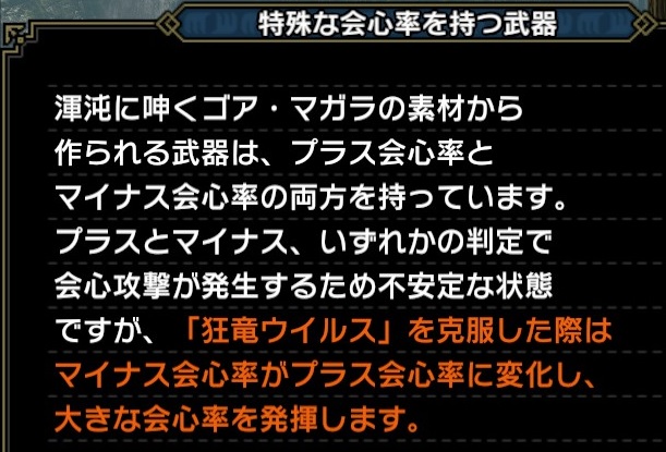 ふんふん なるほど。狂竜症を発症しているとマイナス会心で、克服するとプラス会心が反映されるのね。条件付きのわりにプラスの会心率が低いから使いづらそう。