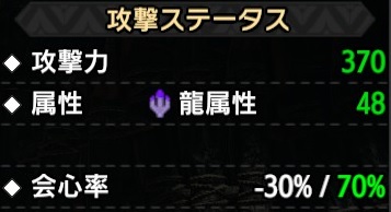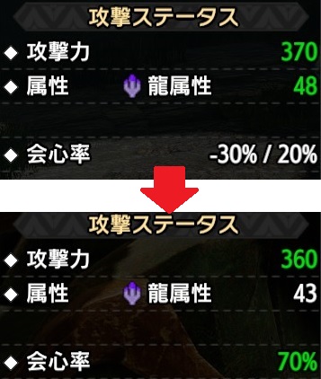 -30%が+30%に変化し、元からある20%の会心率と合算され50%の会心率となります。さらに狂竜症の克服により+15%されるため65%、狂竜症【蝕】を発動させていた場合さらに+5%(Lv1の場合)され、70%の会心率となります。