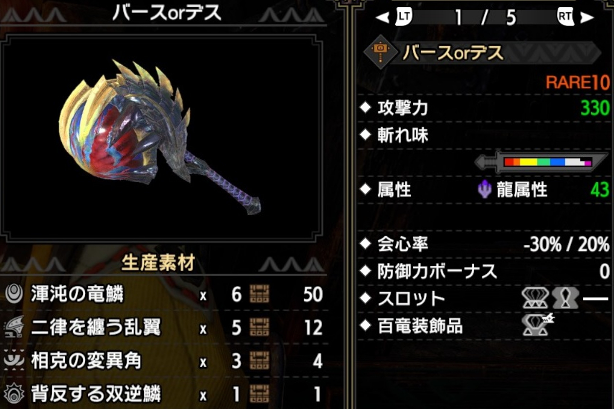 ふんふん なるほど。狂竜症を発症しているとマイナス会心で、克服するとプラス会心が反映されるのね。条件付きのわりにプラスの会心率が低いから使いづらそう。