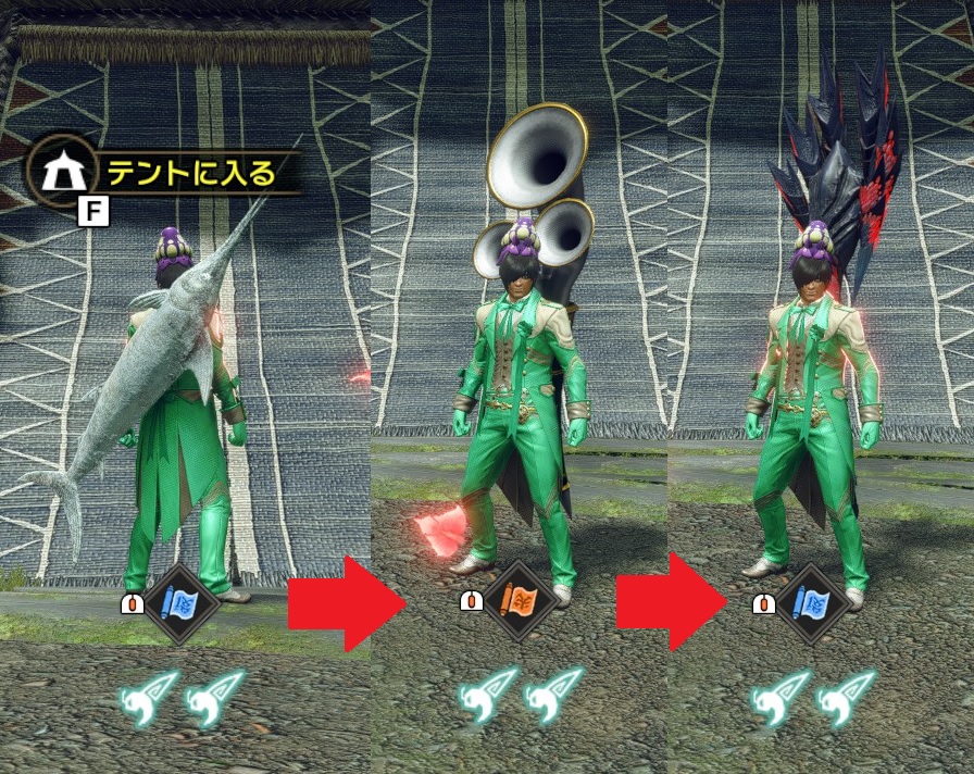 大剣【蒼】の状態でキャンプに入り狩猟笛に変更して出てくると【紅】になります(ここまでは正常)。再度キャンプに入り違う狩猟笛に変更して出ると【蒼】になります。