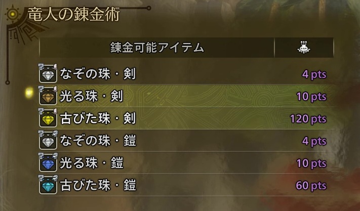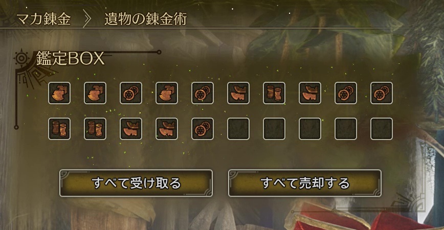 金の遺物チケットは1200ポイントで古びた武器片に15回、金の錬金チケットは1200ポイントで古びた珠・剣に10回チャレンジできます。