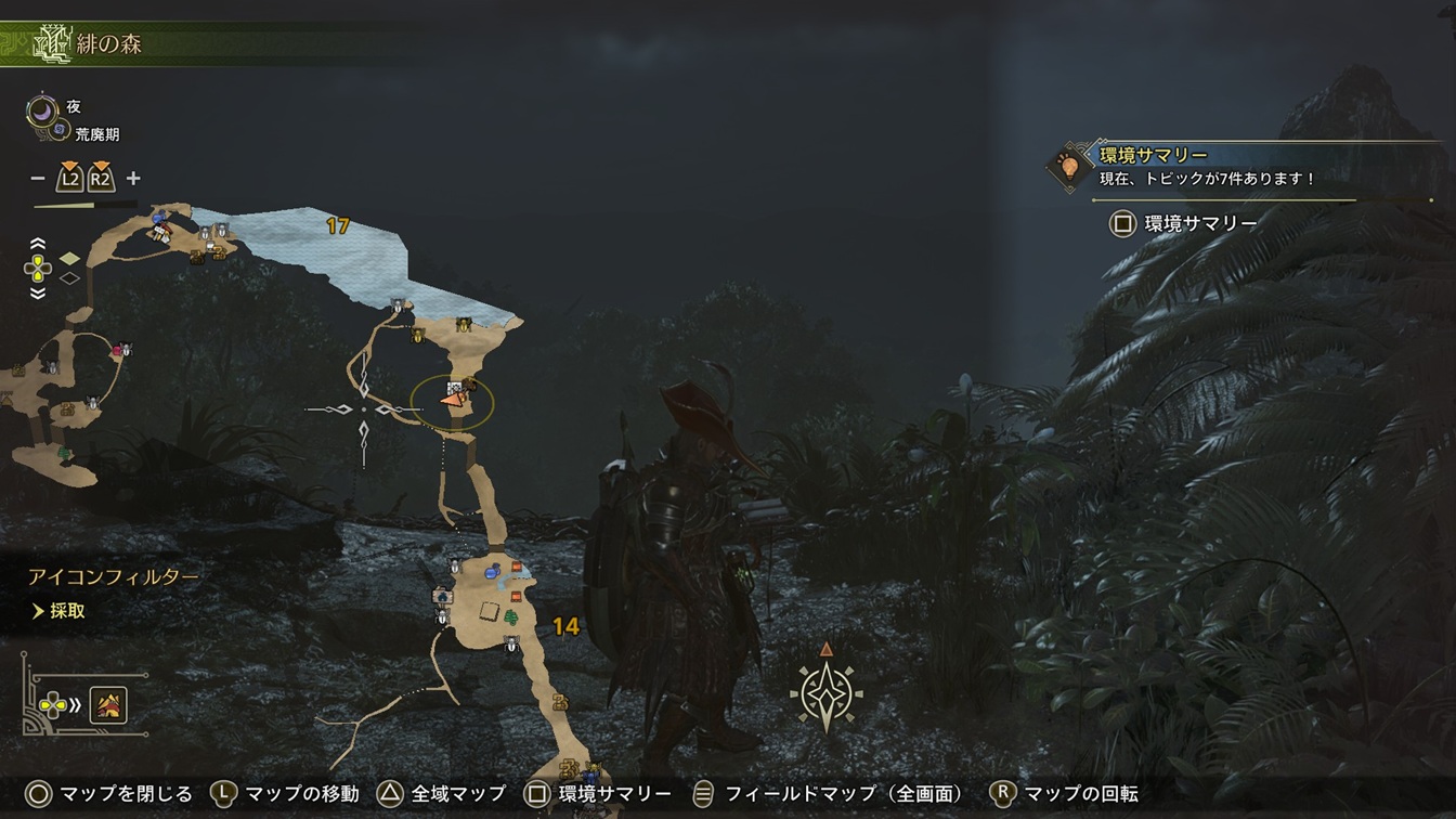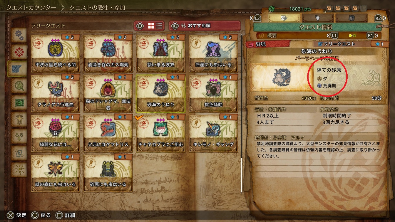 なお緋の森では夕方から開始するフリークエストが無いためこの方法は使えません。また満月の日の夕方時点で調査クエストを保存してみましたが、クエストを開始しても花は咲きませんでした。