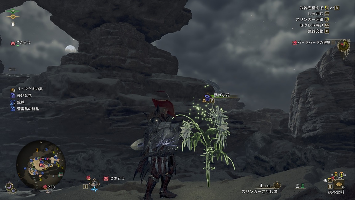 それは満月の日である判定の時間帯(おそらく昼から夜が明けるまで)の間にバーラーハーラのフリークエストを受けること。バーラハーラのクエストは全て夕方から始まります。これを利用し「満月の日」判定のタイミングでこのクエストを始めると開始から1分程度で夜に切り替わるため、花が咲く条件を満たし開始後すぐに入手することができます。隔ての砂原には2ヵ所あるため1回で2個とれます。入手後にクエストから帰還し、再度クエストを受けることで何度も花を取ることができます。ただしクエスト中も満月の日の時間は進むため、できるだけ早く回した方がよいです。