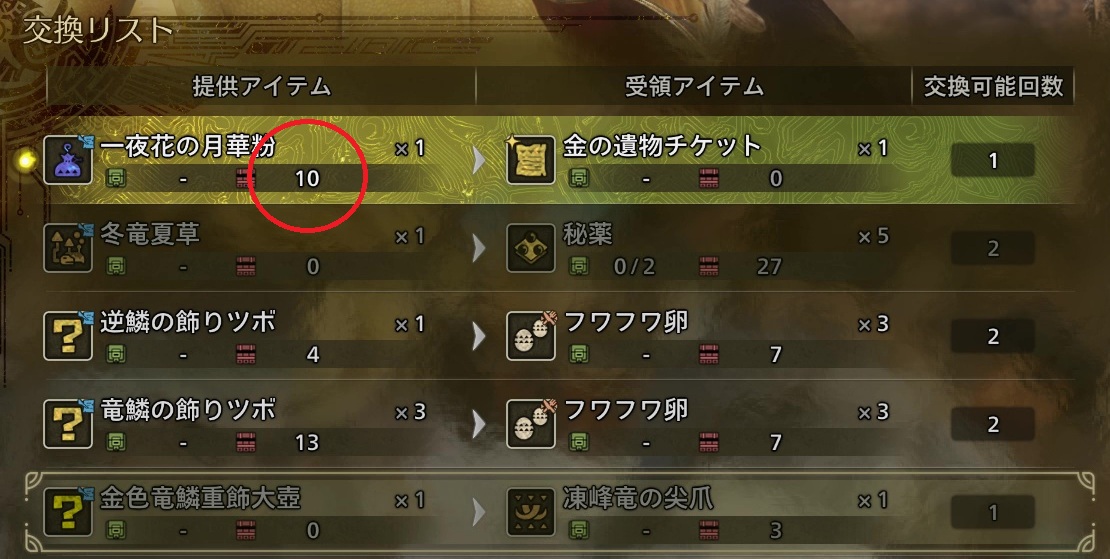 もちもの交換リストに登場しますが入手手段が不明だった特産品「一夜花の月華粉」