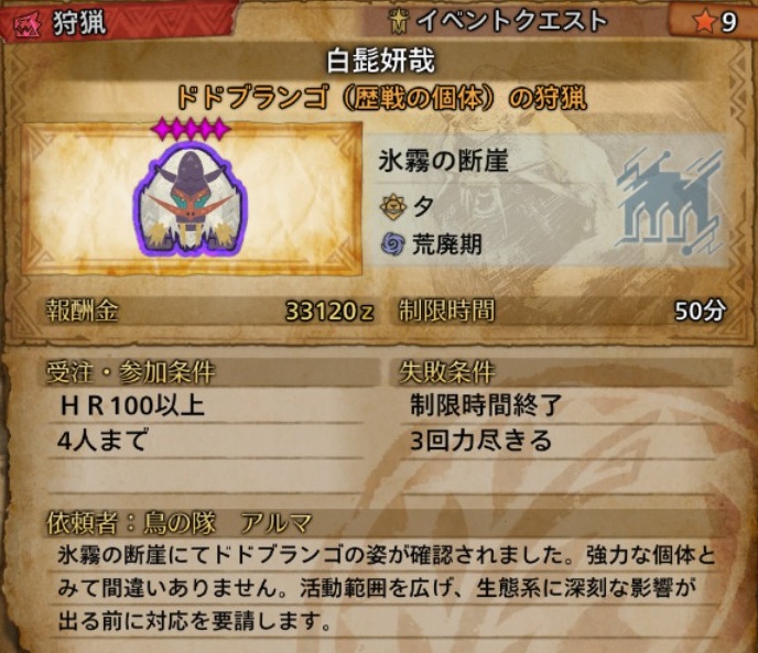 目標は歴戦ドドブランゴの狩猟です。あまり出番のないドドブランゴを狩る機会になりそうですね。