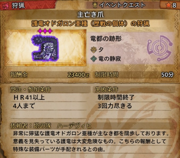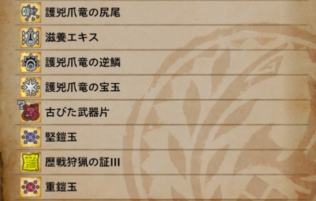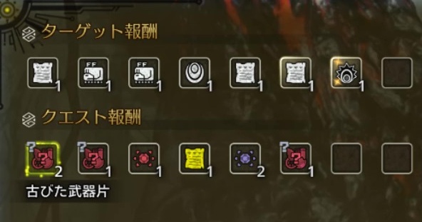 古びた武器片が手に入ります。歴戦狩猟の証がなぜか3。もしや設定ミス?(追記★8なので正しいようです)