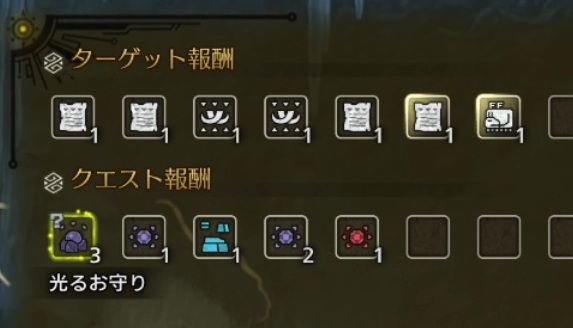 報酬に光るお守りがあります。そして地味に歴戦討伐の証が入っていません。