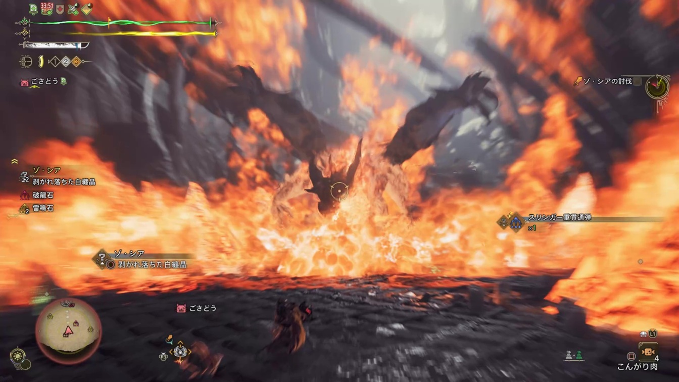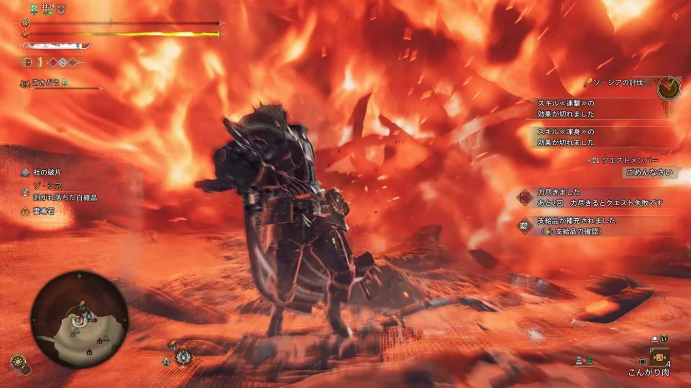 ゾ・シアが中盤に使ってくる炎ブレスです。これは即死ダメージではなくDOTの高速大ダメージであるため、大回復ミツムシの霧であれば耐えることができる・・・はずなんですが・・・。