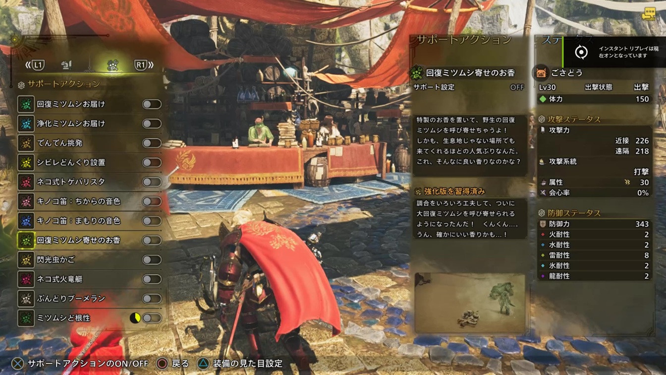 しかし今回のアプデでオトモ行動のON・OFFができるようになりました。クエスト開始前にミツムシお香をOFFにしてクエスト開始後にONにすればシステムが混乱して使うようになるのではないか、と思いました。