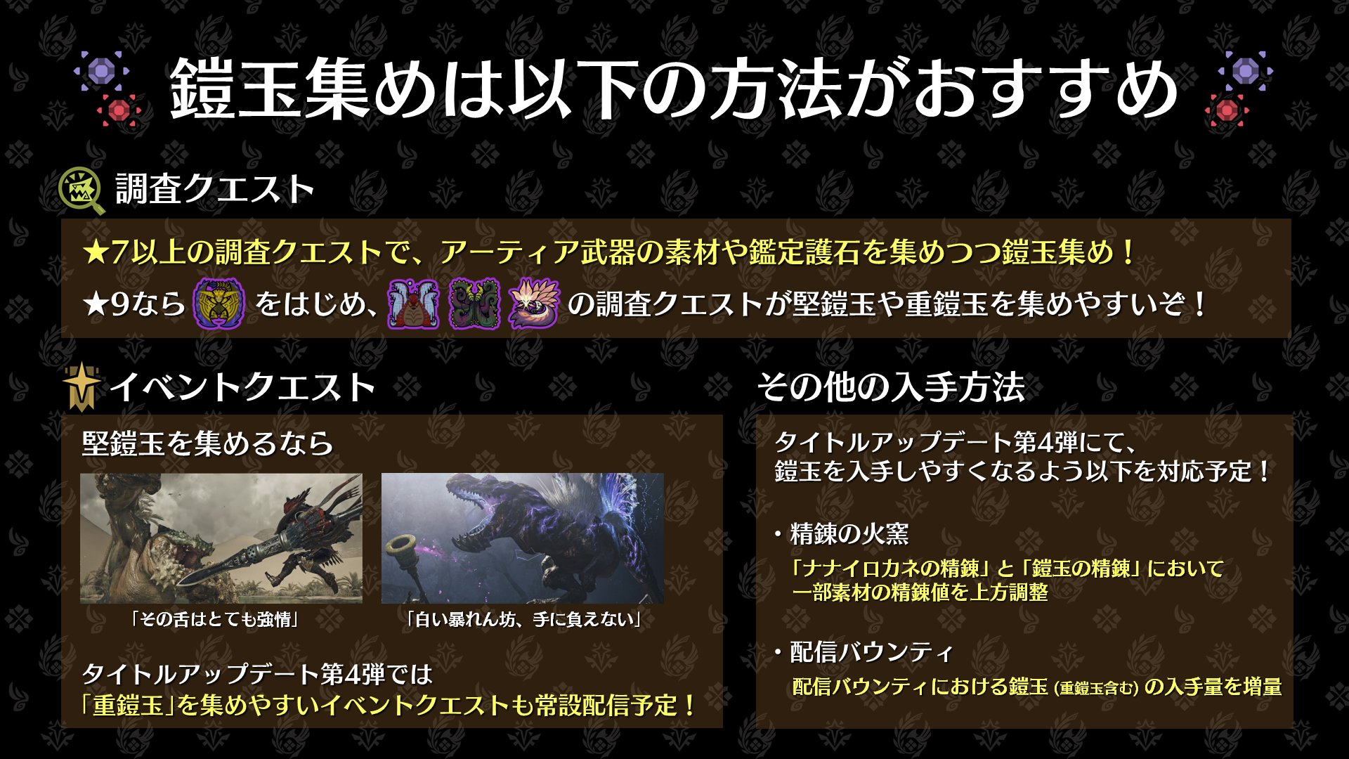 タイトルアップデート第4弾では、鎧玉がより入手しやすくなる対応も予定していますので、ぜひ★7以上の調査クエストやイベントクエストで鎧玉を集めつつ、お待ちください!
