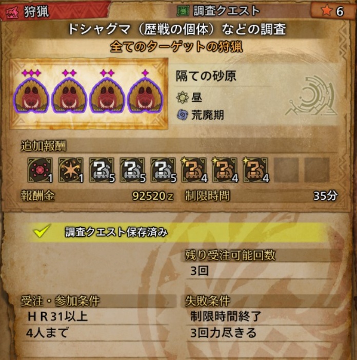 今回はこちらのクエストをソロで攻略しました。重鎧玉が報酬にあり報酬金も92520zと高額です。どのくらいのナナイロカネ換算で収益があるか調べてみます。