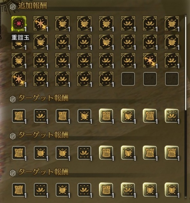 今回のクエは報酬枠がすごく良いわけではないので、オレンジ素材埋め尽くしのクエがあればもっと効率が高いかもしれません。他の効率の高い方法では高難度のフリクエ3頭クエでナナイロカネが20個くらい出ますが、30分くらいかかりかなり大変なクエストなので個人的にはあまりおすすめできません(確認していませんが最初から参加していないと報酬が貰えないらしいです。)
