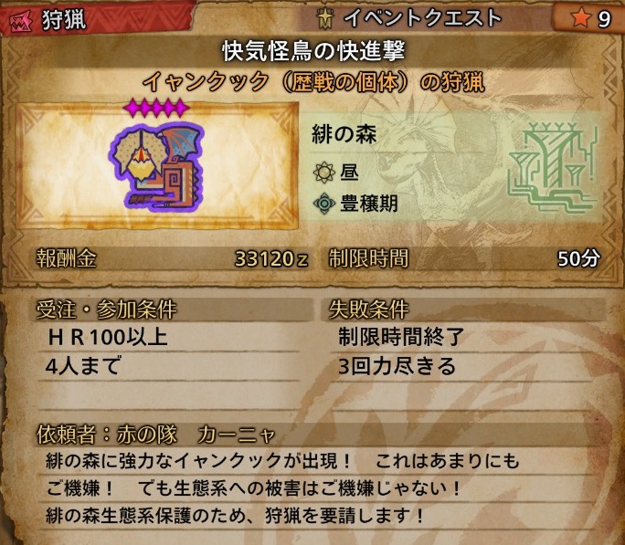 ★9イャンクックの登場です。光るお守りやナナイロカネが報酬にあります。
